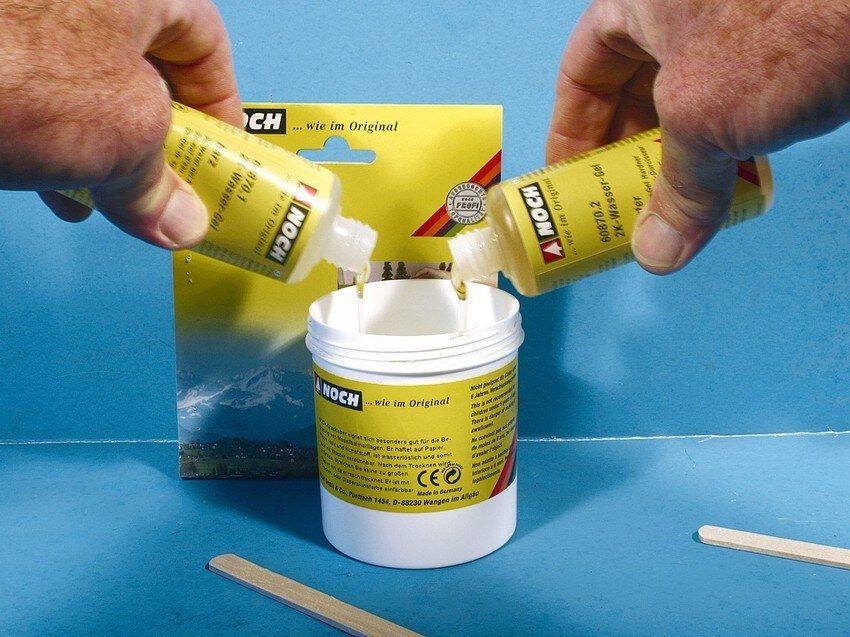 Stille Wasser sind tief! Gewässer-Gestaltung mit 2K-Wasser-Gel "transparent" Das 2K-Wasser-Gel "transparent" ist ein faszinierendes Material: einfach in der Verarbeitung und begeisternd im Ergebnis. Zur Nachbildung stehender Gewässer wie Seen oder Weiher ist das 2K-Wasser-Gel "transparent" die beste Wahl! Auch Flüsse und Bäche lassen sich sehr schön im Modell darstellen.Für die Gestaltung der Wasseroberfläche können z. B: Wasser-Effekte oder Wellen & Wogen verwendet werden.Die Anwendung des 2K-Wasser-Gel "transparent" ist denkbar einfach: Zuerst mischen Sie die beiden Komponenten im Verhältnis 1:1. Nun haben Sie ca. 120 Minuten Zeit, um das 2K-Wasser-Gel "transparent" zu verarbeiten. Die Konsistenz des 2K-Wasser-Gel "transparent" verändert sich innerhalb dieser Zeit von dünnflüssig zu zähflüssig.Zur Kolorierung des Untergrunds können Sie je nach gewünschtem Farbergebnis unsere Boden-Strukturpasten oder unsere Acrylfarben verwenden. Vorteile des 2K Wasser-Gels: Einfache Verarbeitung Lange Verarbeitungszeit Wird kalt verarbeitet Einfach einzufärben Ideal für stehende Gewässer